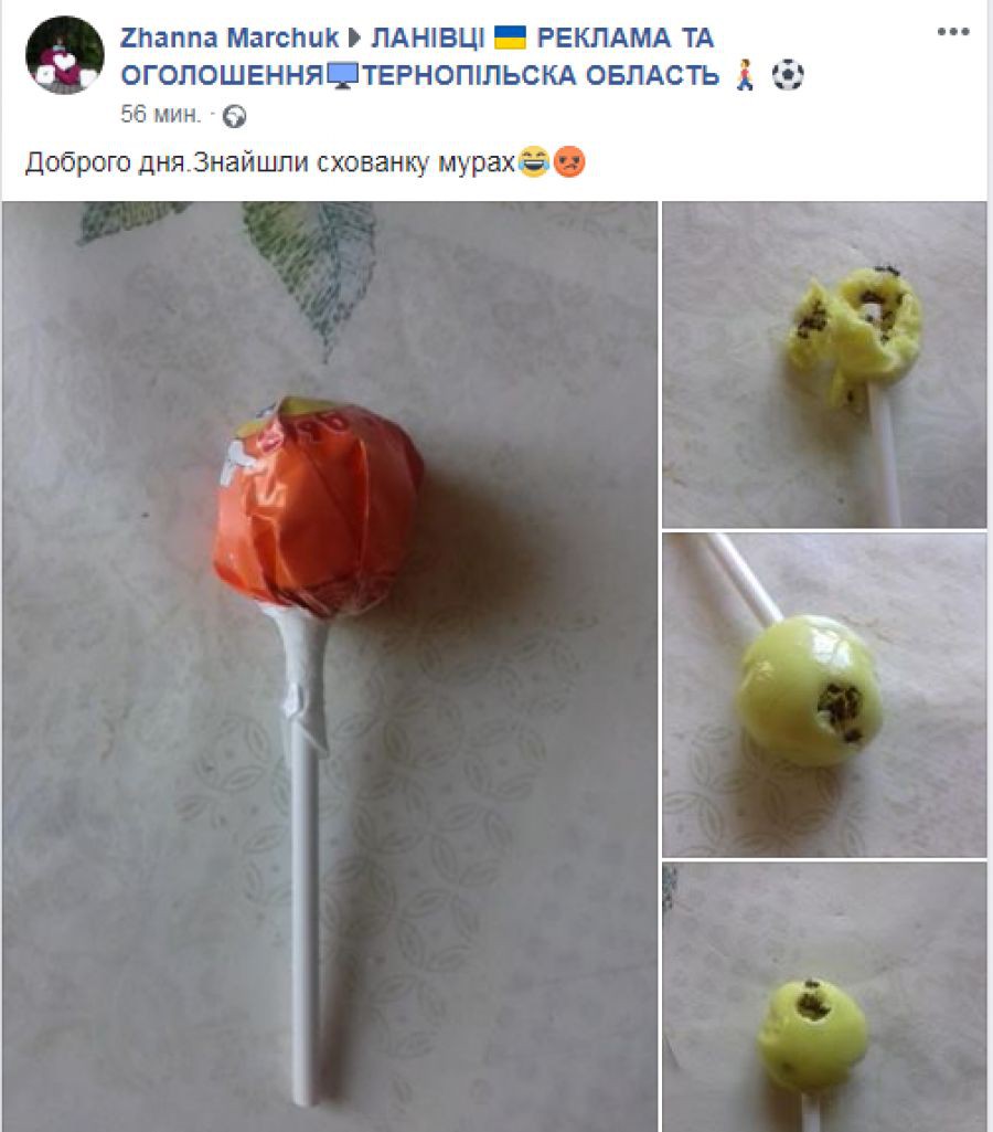 Мешканка Лановеччини Жанна Марчук купила чупа-чупс із мурахами. Про це вона повідомила у Фейсбук-спільноті.